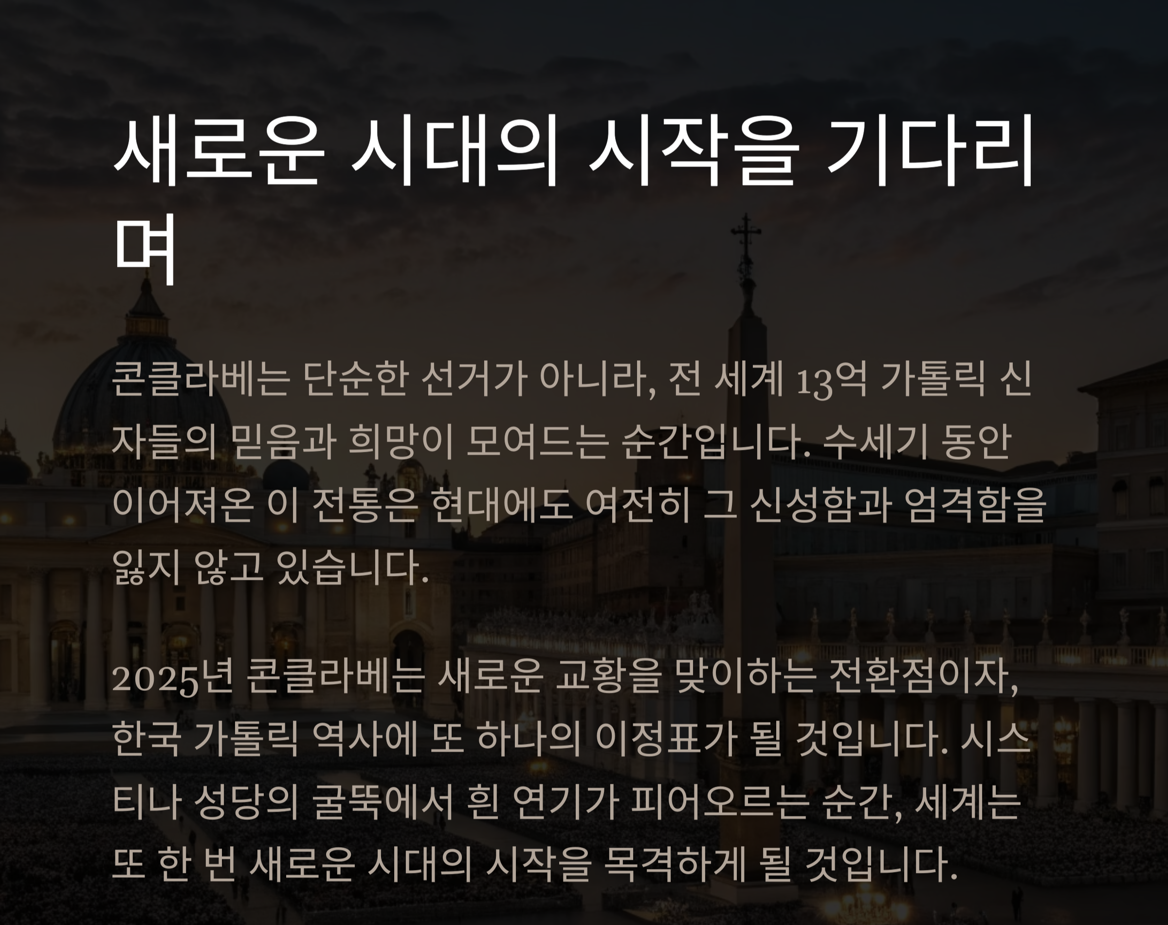 시스티나 성당의 굴뚝에서 흰 연기가 피어오르는 순간, 세계는 또 한 번 새로운 시대의 시작을 목격하게 될 것입니다.