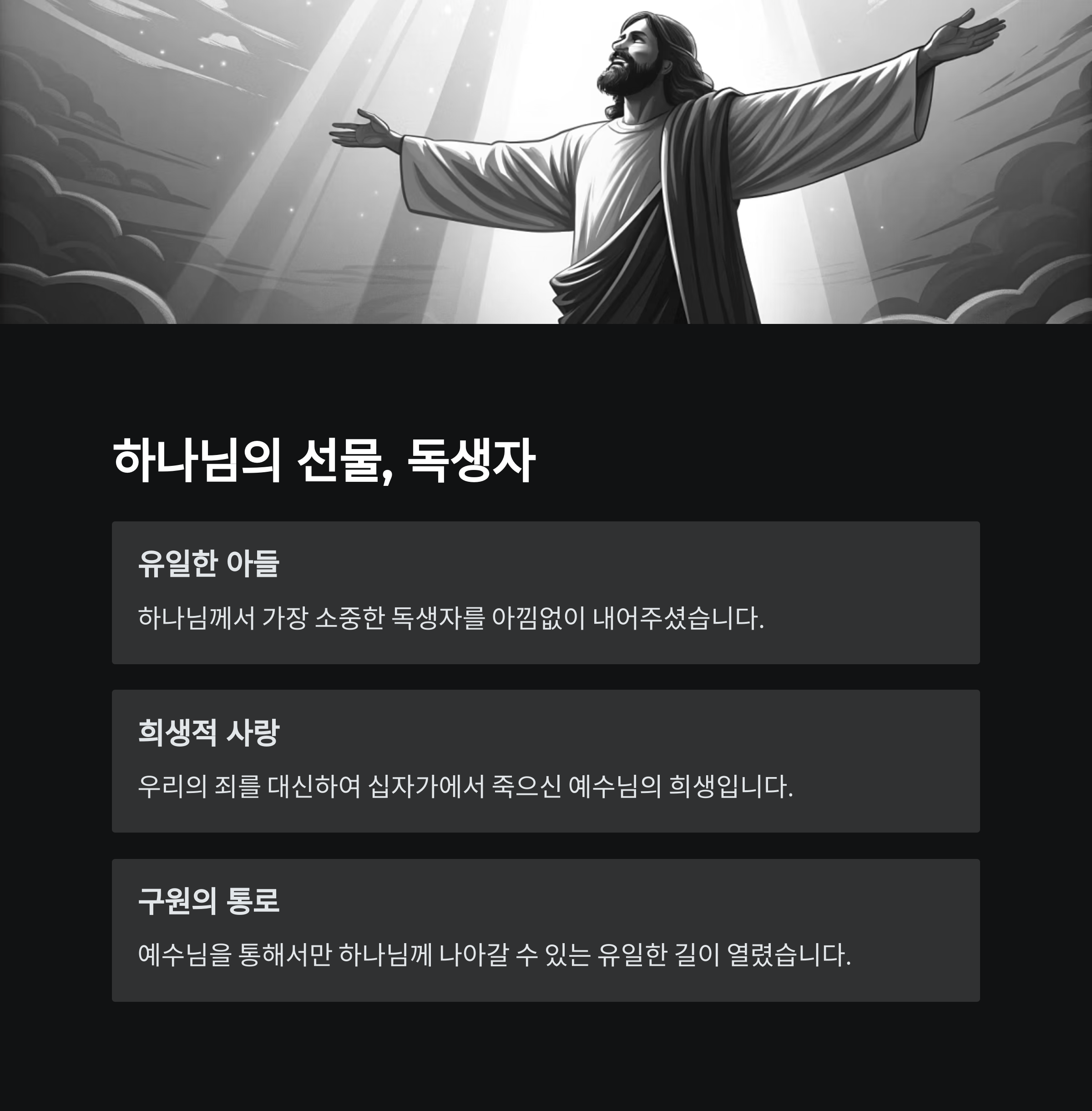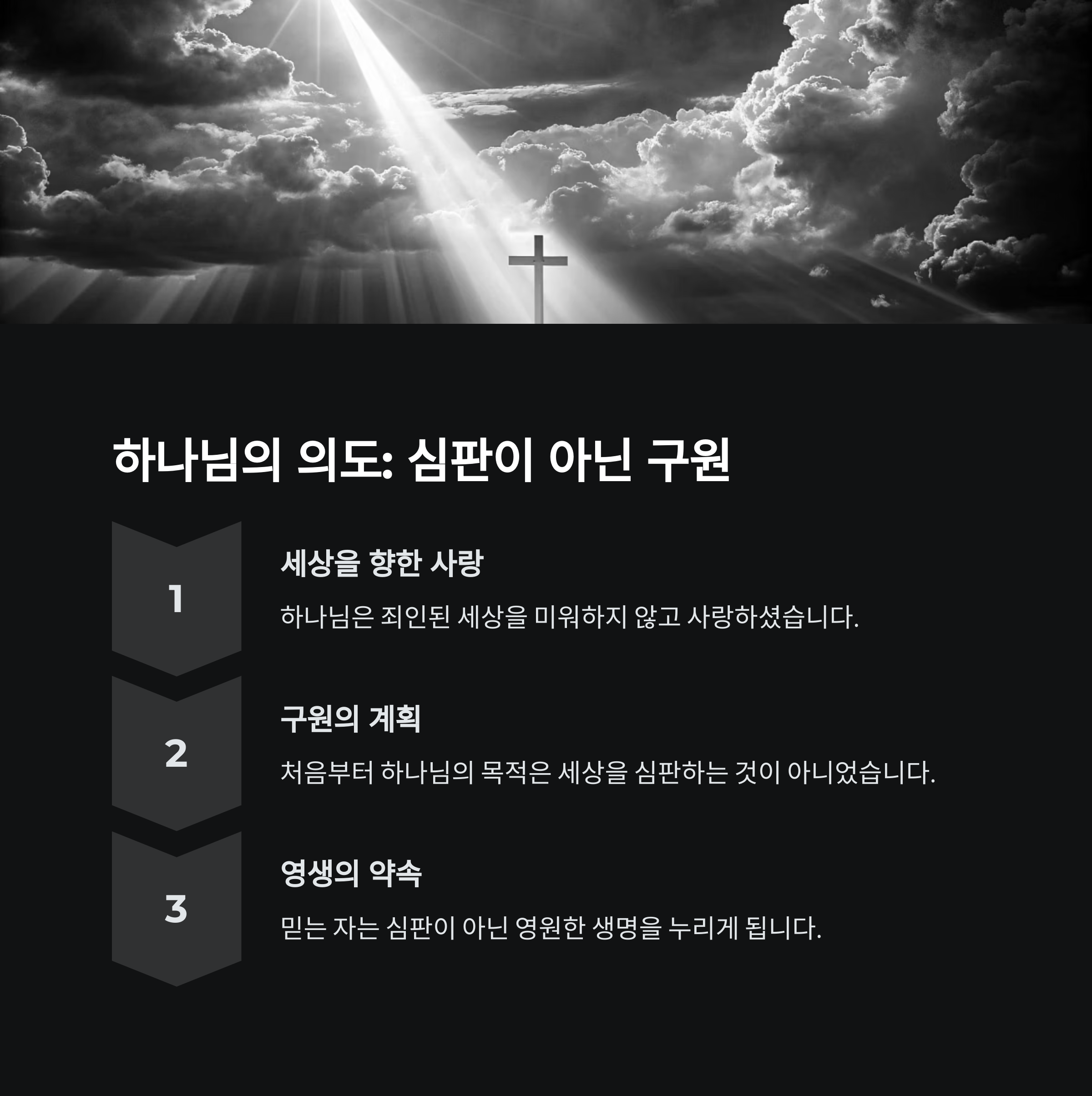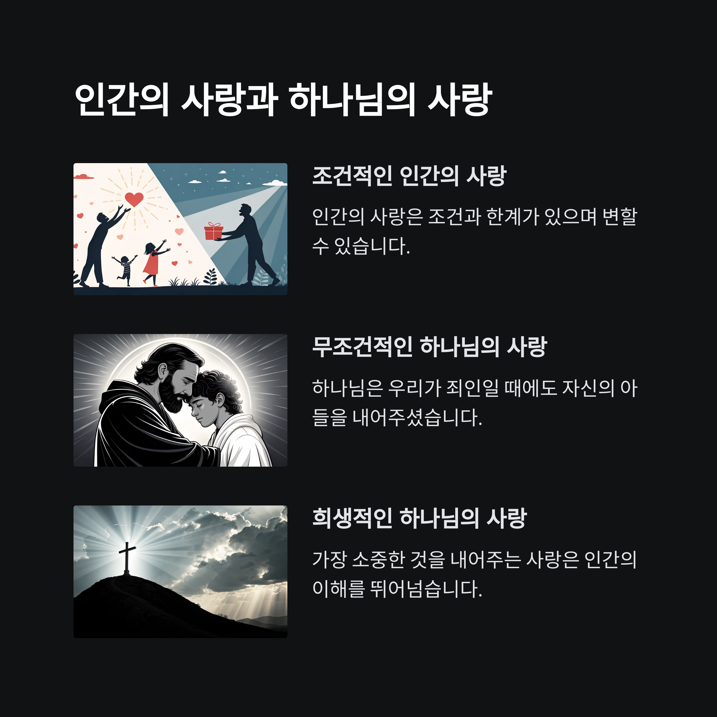 | 하나님의 사랑 | 예수님의 희생 | 믿음과 영생 |