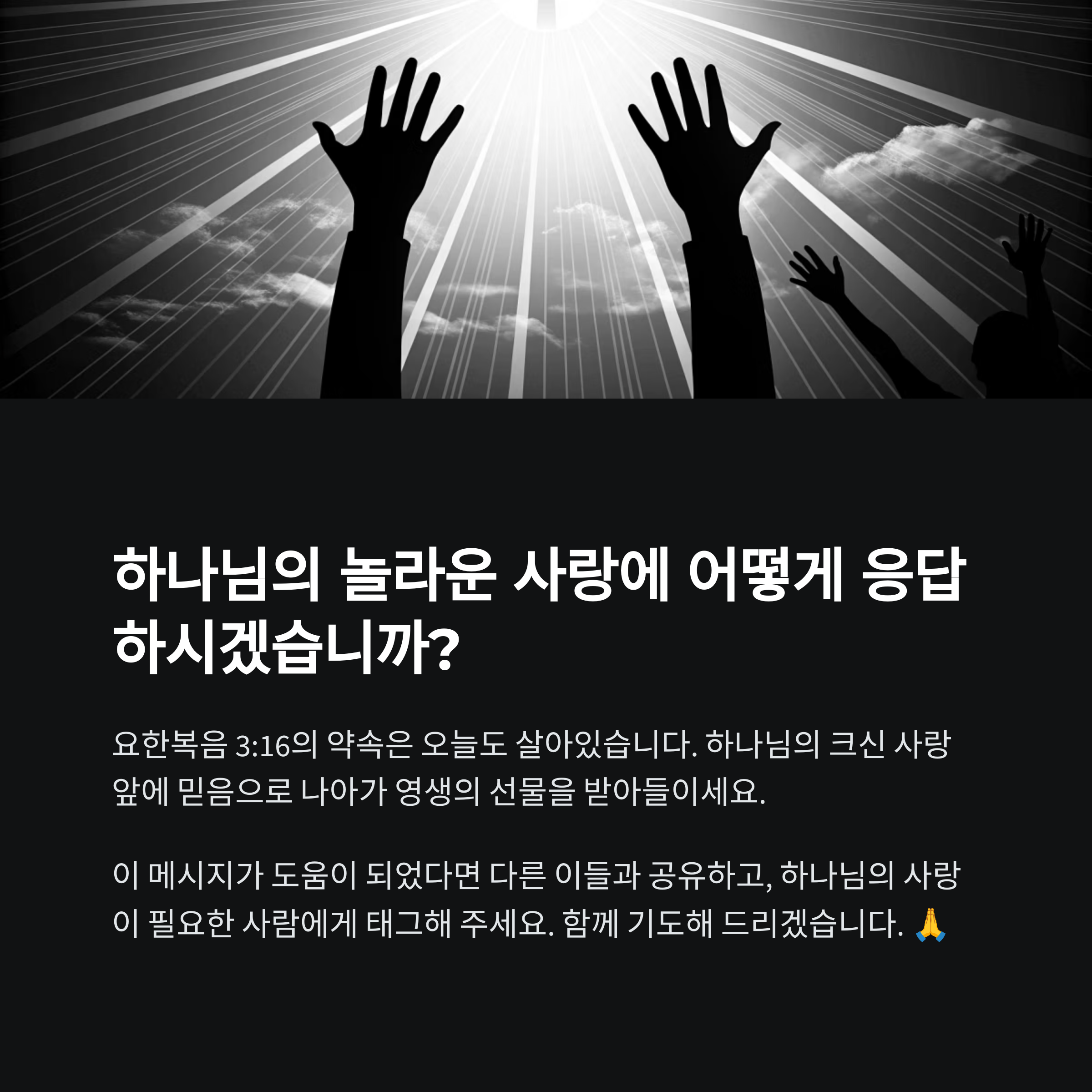 오늘 함께 나눈 말씀에 대해 어떤 마음이 드셨나요? 또는 요한복음 3장 16절을 묵상하며 경험한 이야기나 은혜가 있다면 댓글로 함께 나눠주세요. 서로의 삶을 격려하는 귀한 시간이 되기를 바랍니다.