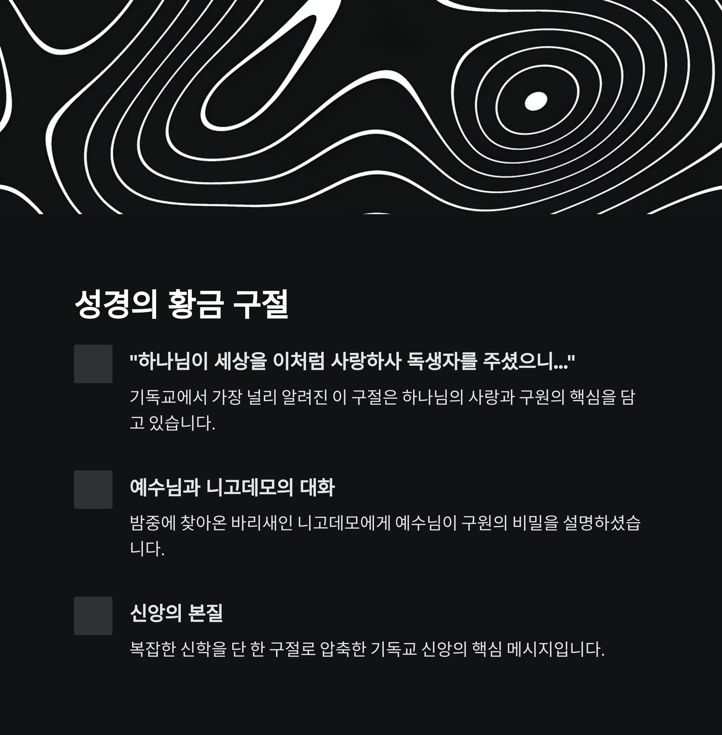 | 요한복음 3:16 | 하나님이 세상을 이처럼 사랑하사 독생자를 주셨다 |