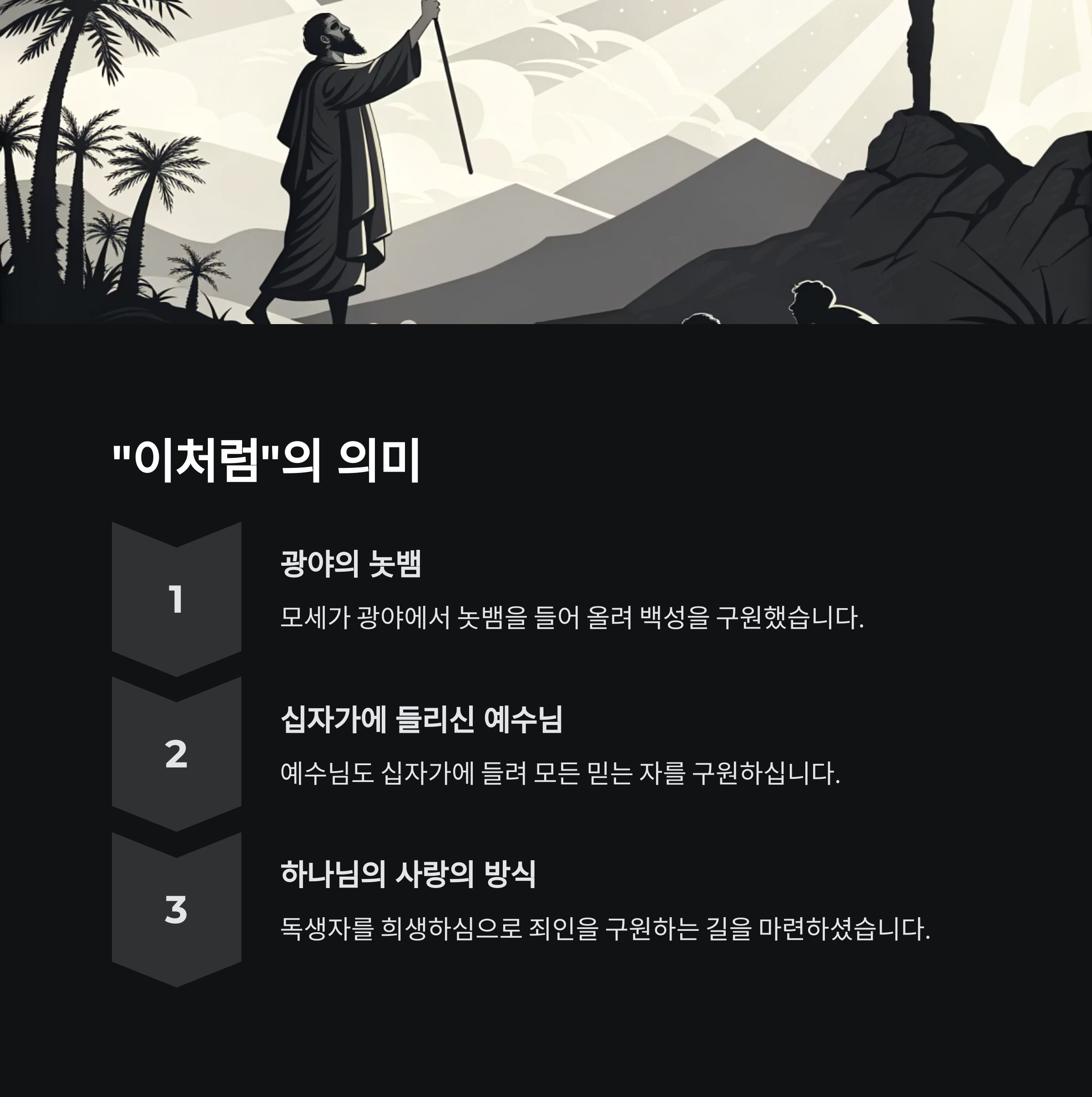 | 그 사랑은 지금도 동일하게 유효합니다. | 죄인을 향한 사랑의 표현입니다. | 믿음은 삶을 변화시키는 열쇠입니다. |