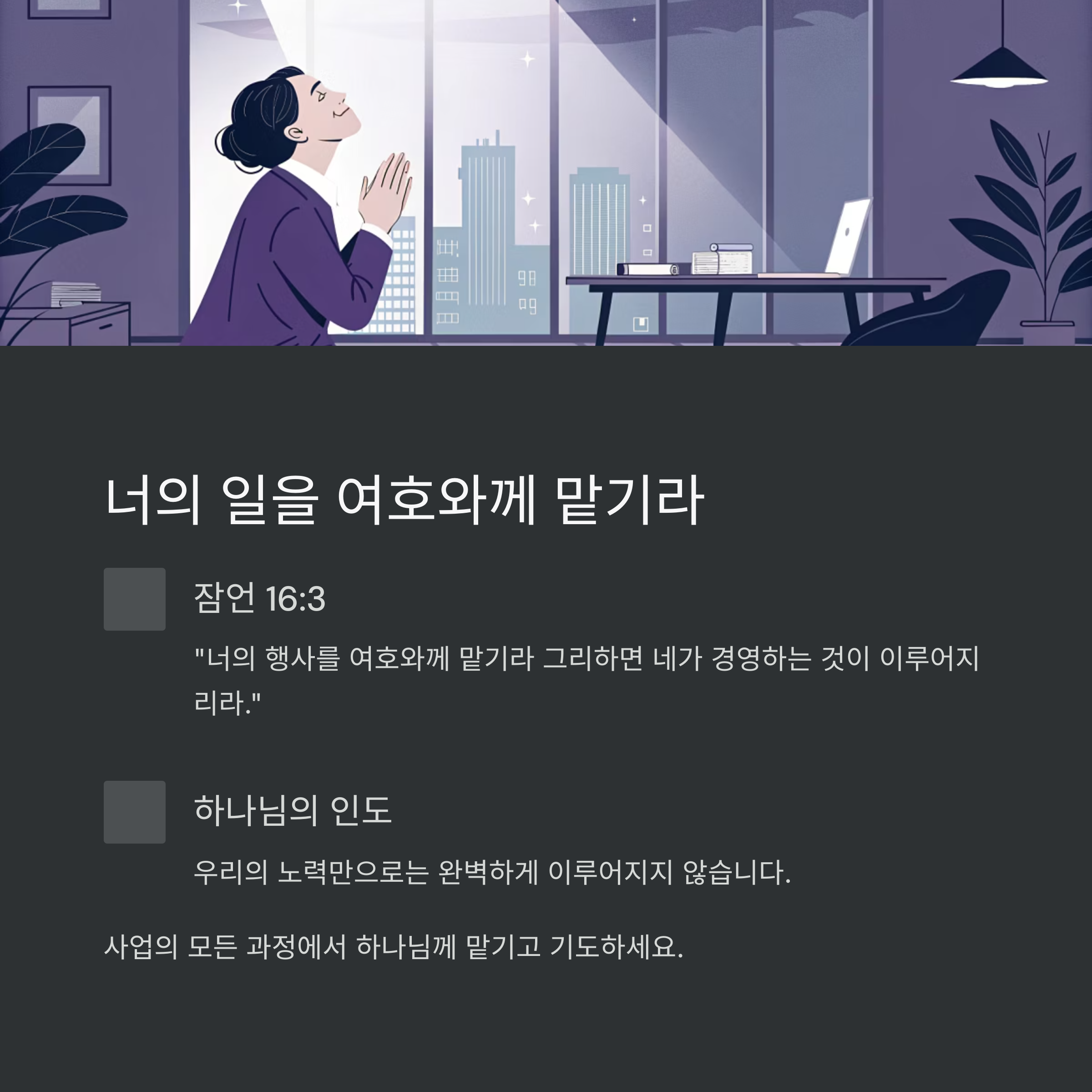 👉 사업의 모든 과정에서 하나님께 맡기고 기도하세요.