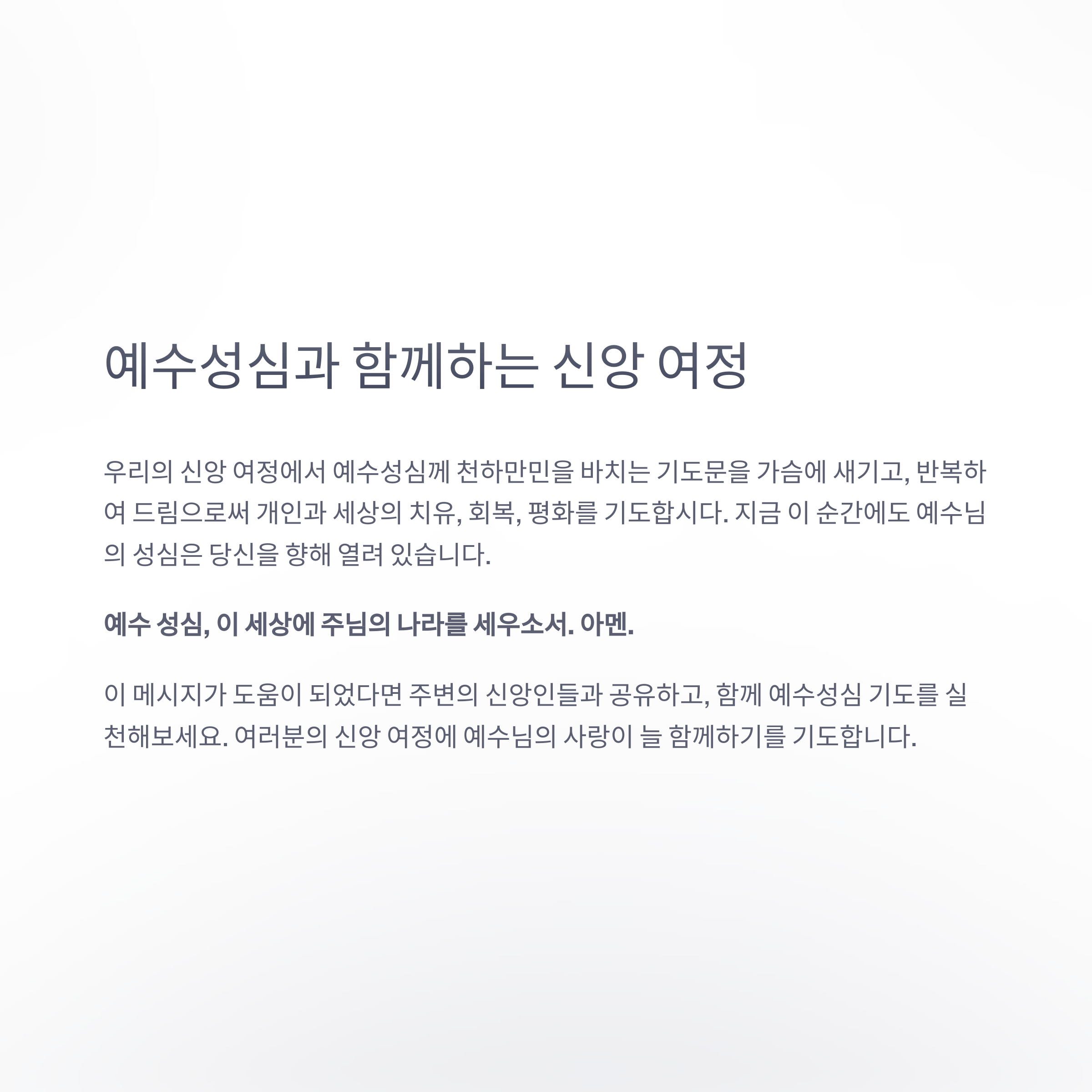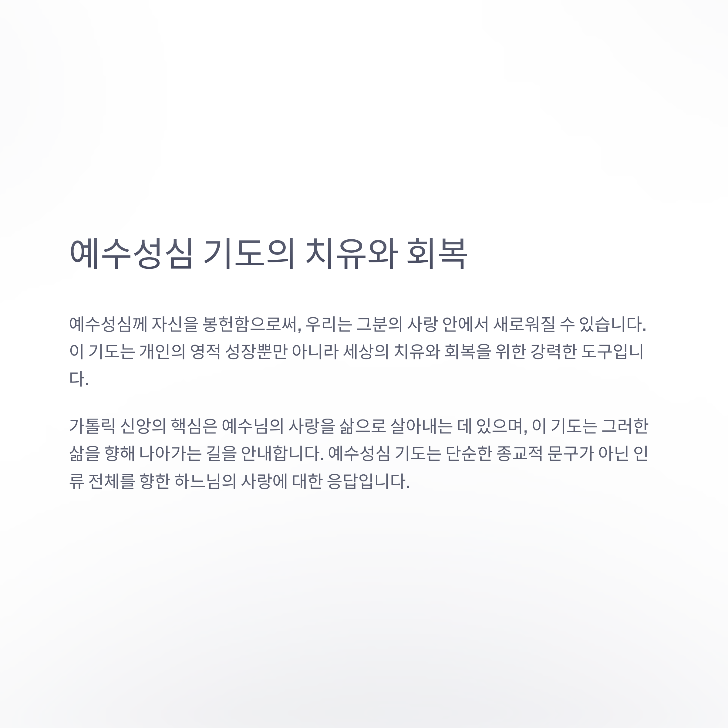 우리의 신앙 여정에서 이 기도문을 가슴에 새기고, 반복하여 드림으로써 개인과 세상의 치유, 회복, 평화를 기도합시다. 지금 이 순간에도 예수님의 성심은 당신을 향해 열려 있습니다.