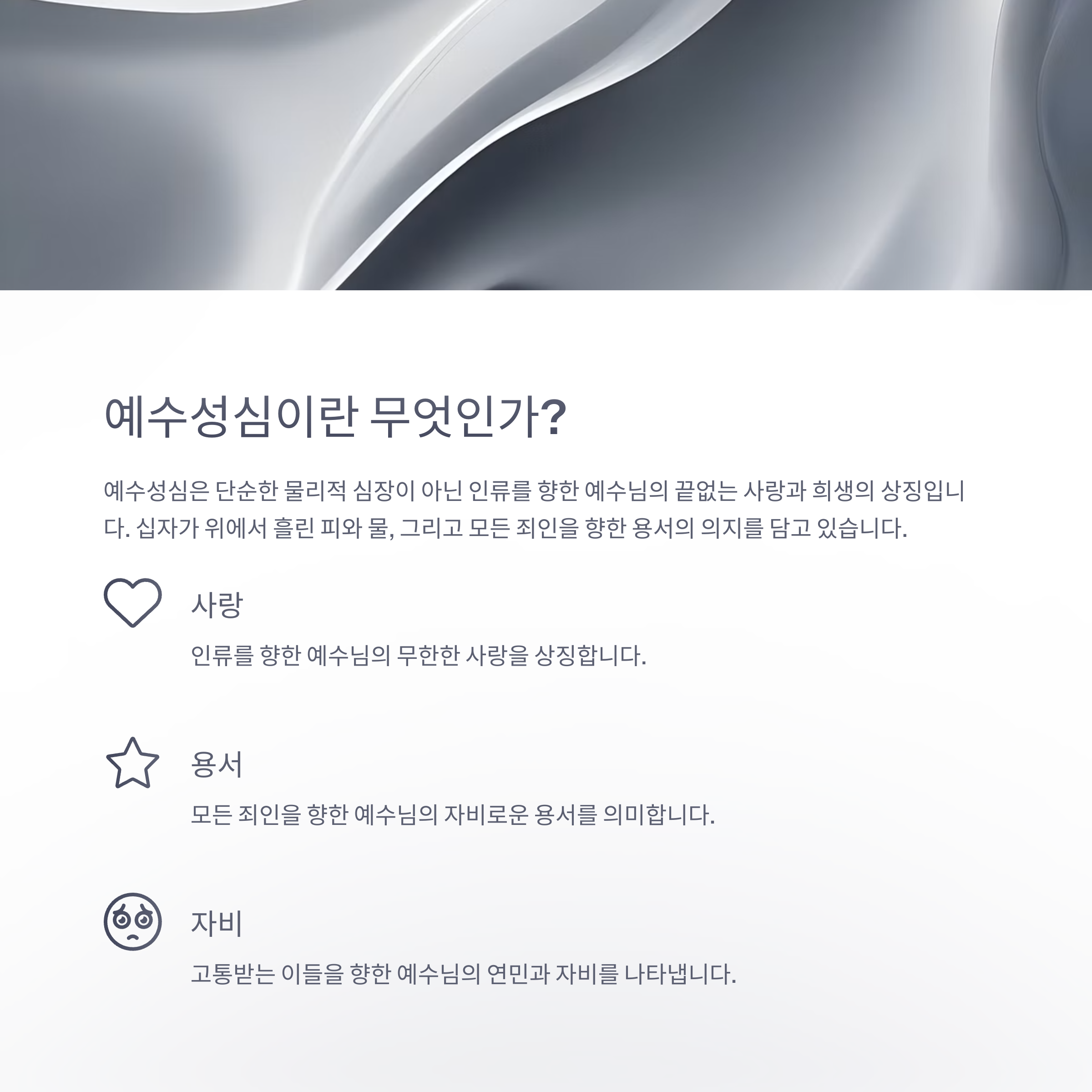 ‘예수성심’은 예수님의 물리적 심장을 의미하는 것이 아니라, 인류를 향한 예수님의 끝없는 사랑과 희생을 상징합니다. 이는 십자가 위에서 흘린 피와 물, 그리고 모든 죄인을 향한 용서의 의지를 담고 있습니다. 예수성심은 특히 사랑, 용서, 자비라는 세 가지 핵심 개념을 통해 표현되며, 이러한 영적 상징은 성경과 성전 안에서 일관되게 드러납니다.