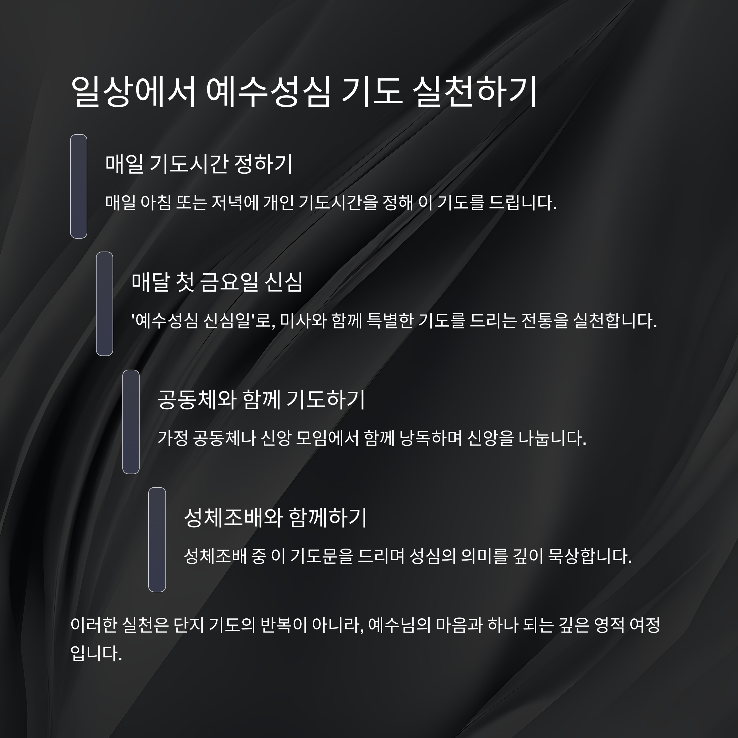 이러한 실천은 단지 기도의 반복이 아니라, 예수님의 마음과 하나 되는 깊은 영적 여정입니다.