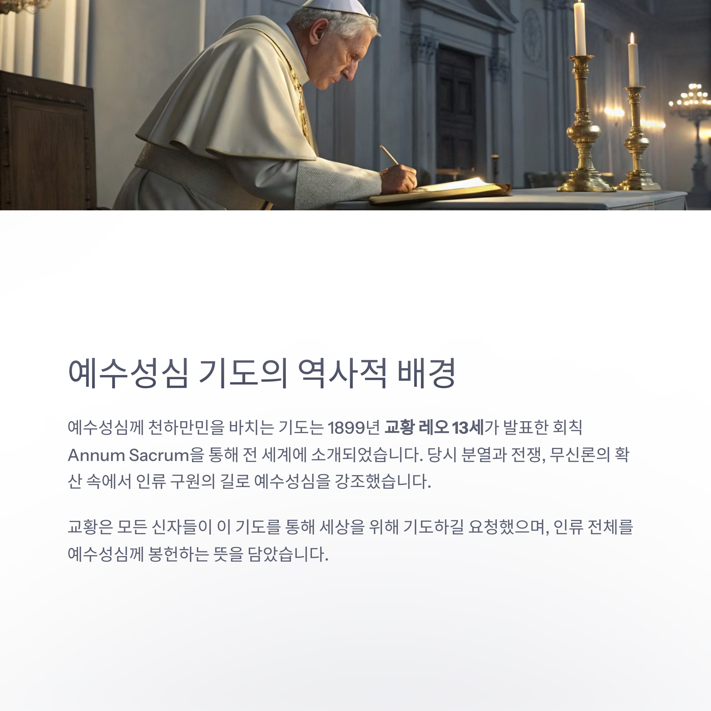 이 기도문은 1899년 교황 레오 13세가 발표한 회칙 Annum Sacrum을 통해 전 세계에 소개되었습니다. 이 회칙은 인류 전체를 예수성심께 봉헌하는 뜻을 담고 있었으며, 이를 바탕으로 공식 기도문이 만들어졌습니다. 교황은 당대의 분열과 전쟁, 무신론의 확산 속에서 인류 구원의 길로 예수성심을 강조하며, 모든 신자들이 이 기도를 통해 세상을 위해 기도하길 요청했습니다.