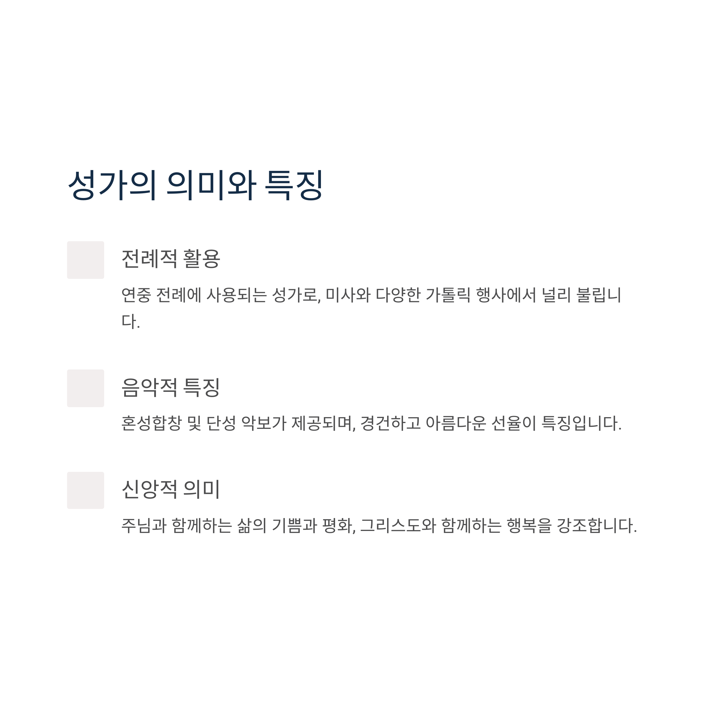 특히 이 곡은 혼성합창과 단성 악보가 함께 제공되어, 성가대뿐 아니라 개인이 묵상용으로 부르기에도 좋습니다. 가톨릭 굿뉴스 성가 자료실 등을 통해 쉽게 악보와 음원을 구할 수 있어 많은 본당에서 이 성가를 애용합니다.