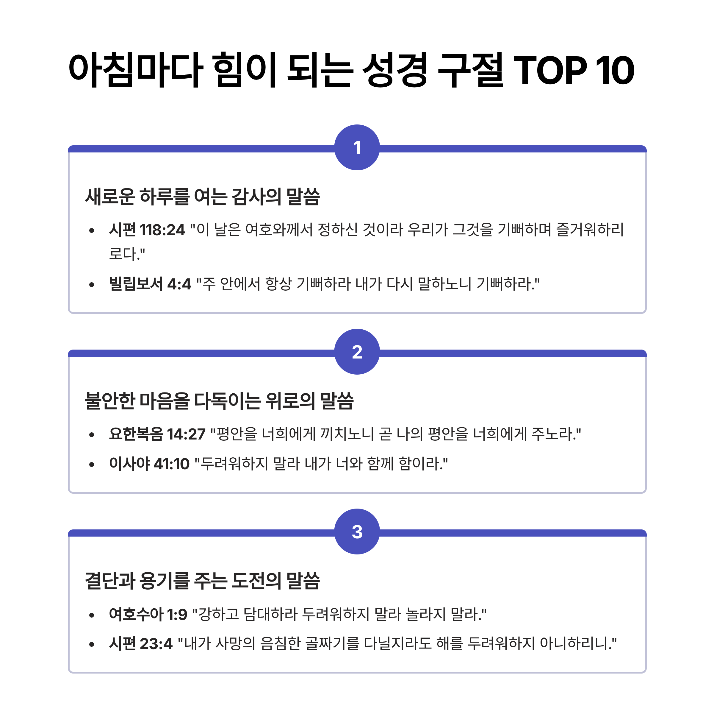 하루를 여는 성경 구절은 단순한 종교적 루틴을 넘어, 내면의 평안을 되찾고 마음을 다잡는 놀라운 힘을 가지고 있습니다. 이 글에서는 아침에 읽으면 좋은 믿음의 말씀, 위로와 평안을 주는 성경 말씀, 상황별 추천 구절을 함께 정리해 드립니다.