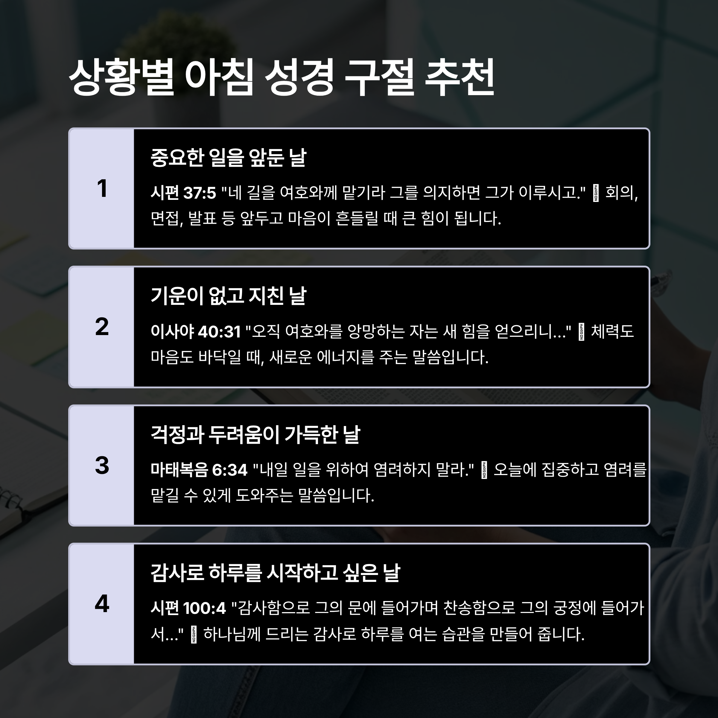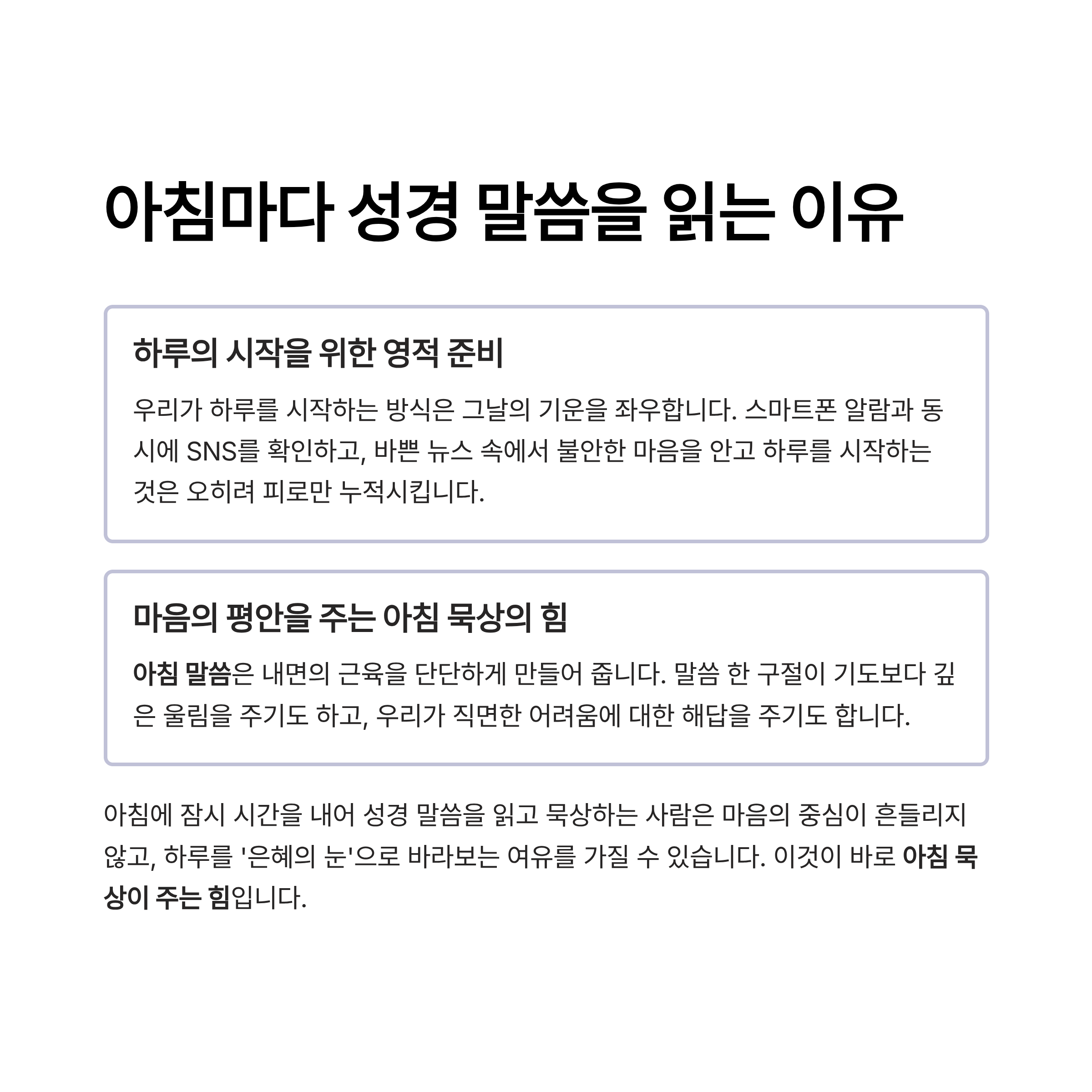 바쁜 하루의 시작, 정신없이 눈을 뜨고 출근 준비에 쫓기다 보면 마음이 급해지고 하루 전체가 불안하게 느껴질 때가 있습니다. 이런 날일수록 단 3분이라도 마음을 잠시 내려놓고, 아침마다 힘이 되는 성경 말씀으로 하루를 여는 습관이 필요합니다.