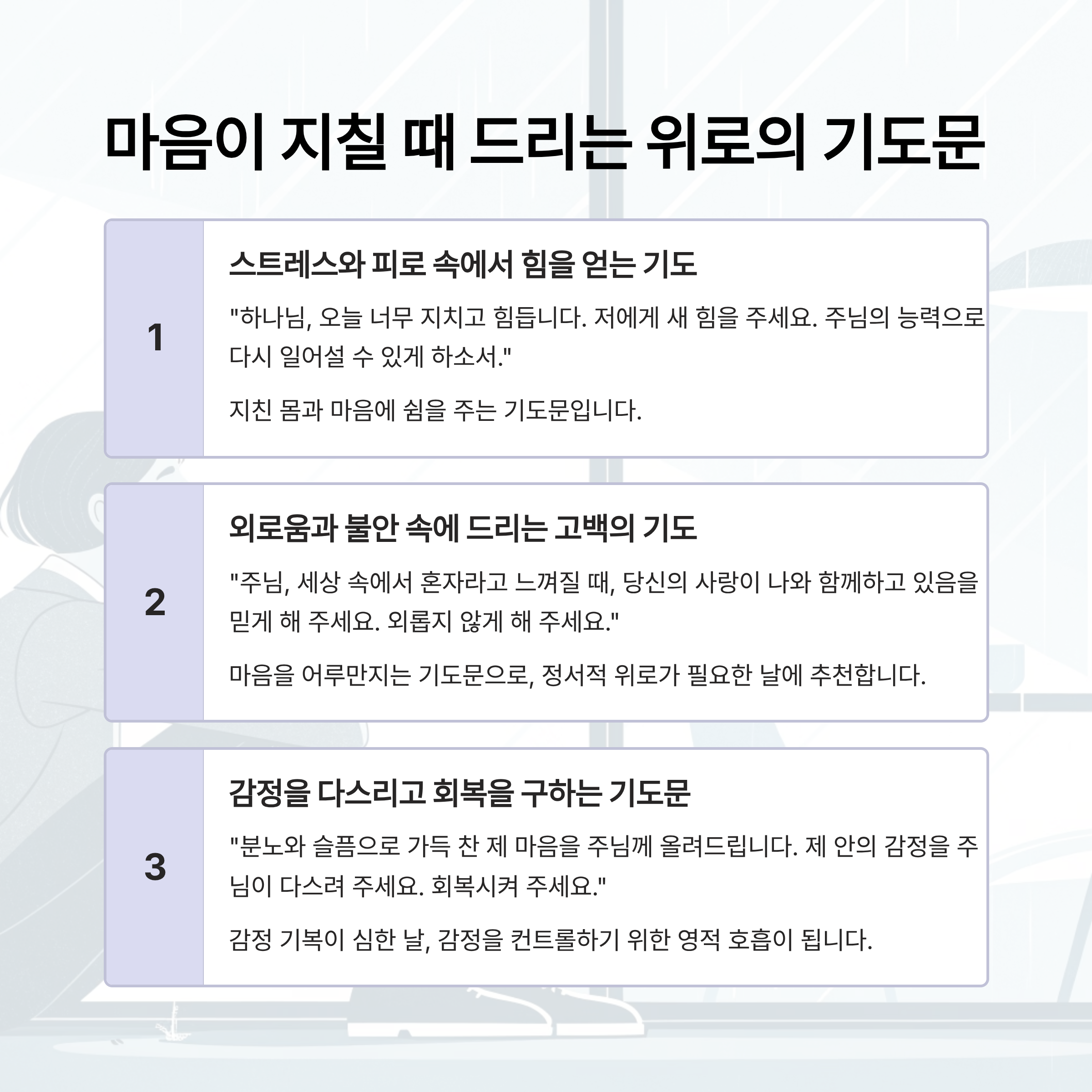 ➡️ 마음을 어루만지는 기도문으로, 정서적 위로가 필요한 날에 추천합니다.