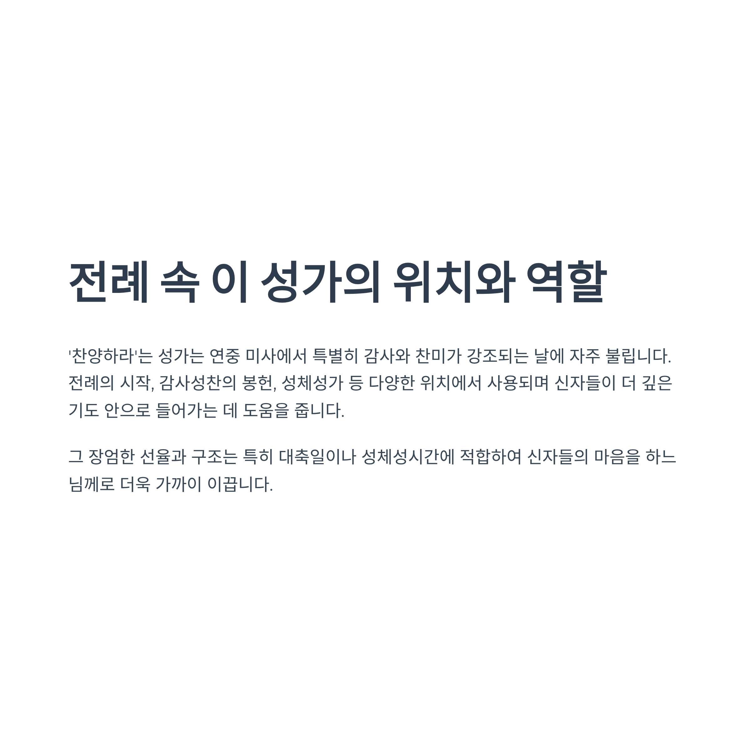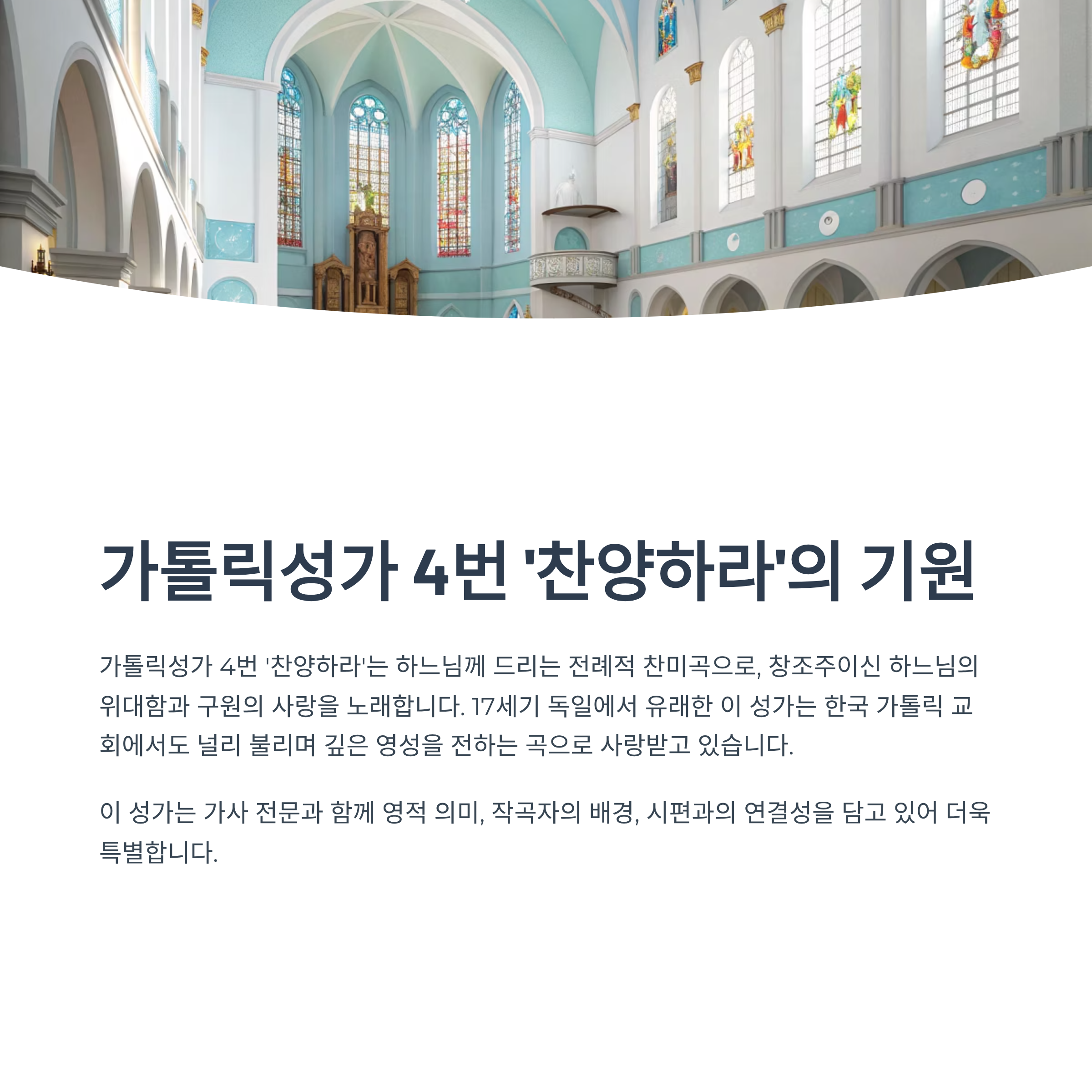가톨릭성가 4번 '찬양하라'는 하느님께 드리는 전례적 찬미곡으로, 창조주이신 하느님의 위대함과 구원의 사랑을 노래합니다. 17세기 독일에서 유래한 이 성가는, 한국 가톨릭 교회에서도 널리 불리며 깊은 영성을 전하는 곡으로 사랑받고 있습니다. 이번 글에서는 가사 전문과 함께 이 성가가 담고 있는 영적 의미, 작곡자의 배경, 시편과의 연결성을 함께 살펴봅니다.