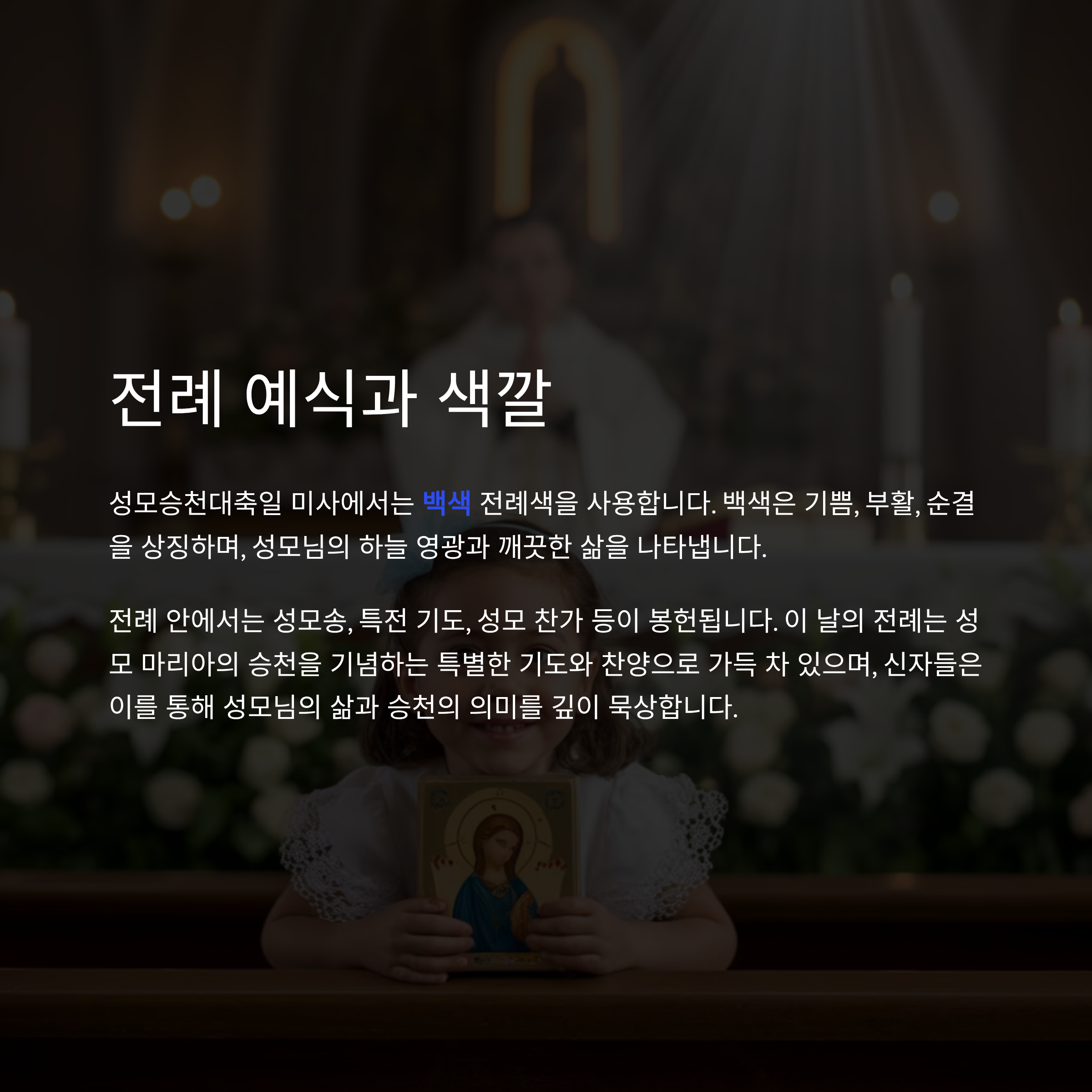 성모승천대축일 미사에서는 백색 전례색을 사용합니다. 백색은 기쁨, 부활, 순결을 상징하며, 성모님의 하늘 영광과 깨끗한 삶을 나타냅니다. 전례 안에서는 성모송, 특전 기도, 성모 찬가 등이 봉헌됩니다.