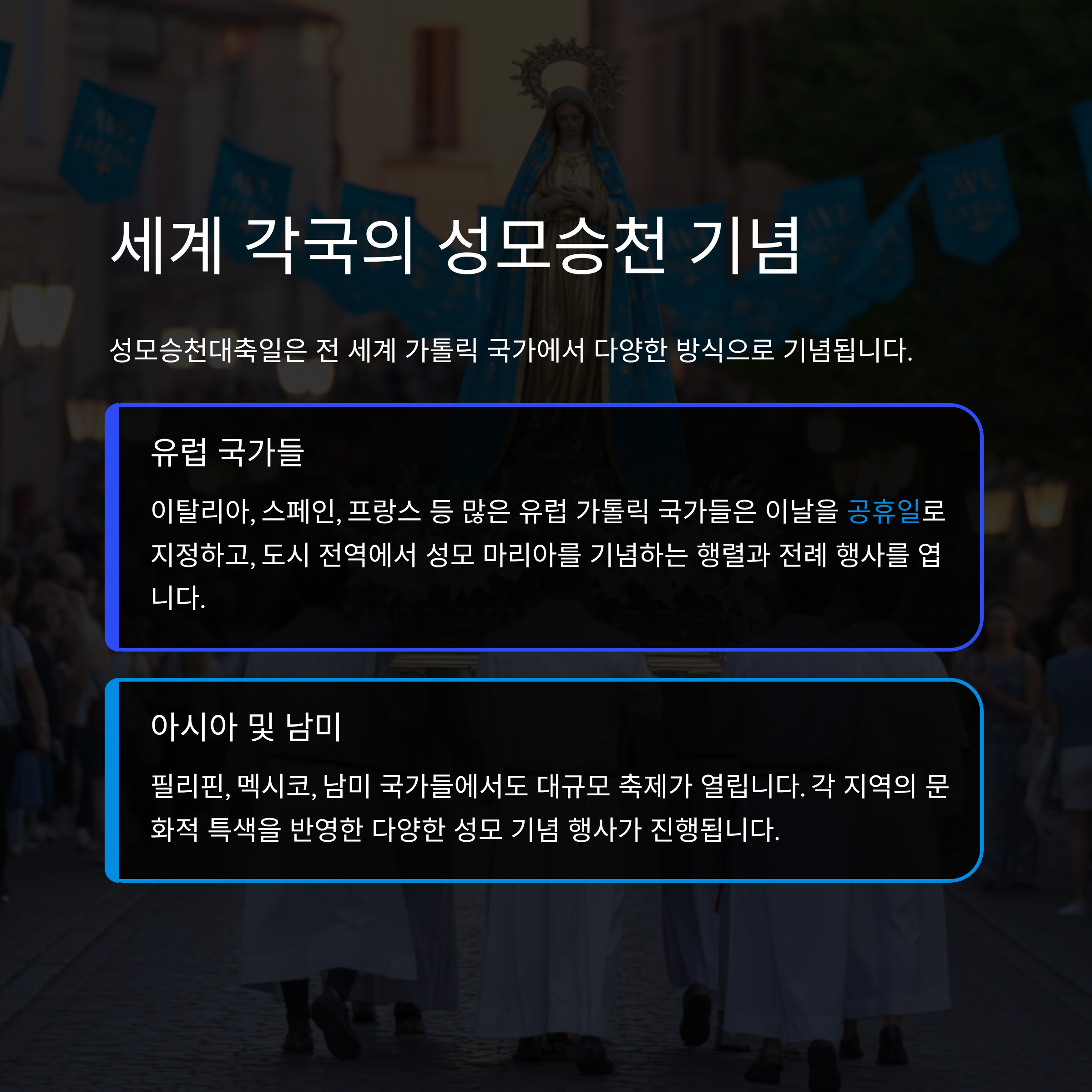 유럽의 많은 가톨릭 국가들(이탈리아, 스페인, 프랑스 등)은 이날을 공휴일로 지정하고, 도시 전역에서 성모 마리아를 기념하는 행렬과 전례 행사를 엽니다. 필리핀, 멕시코, 남미 국가들에서도 대규모 축제가 열립니다.