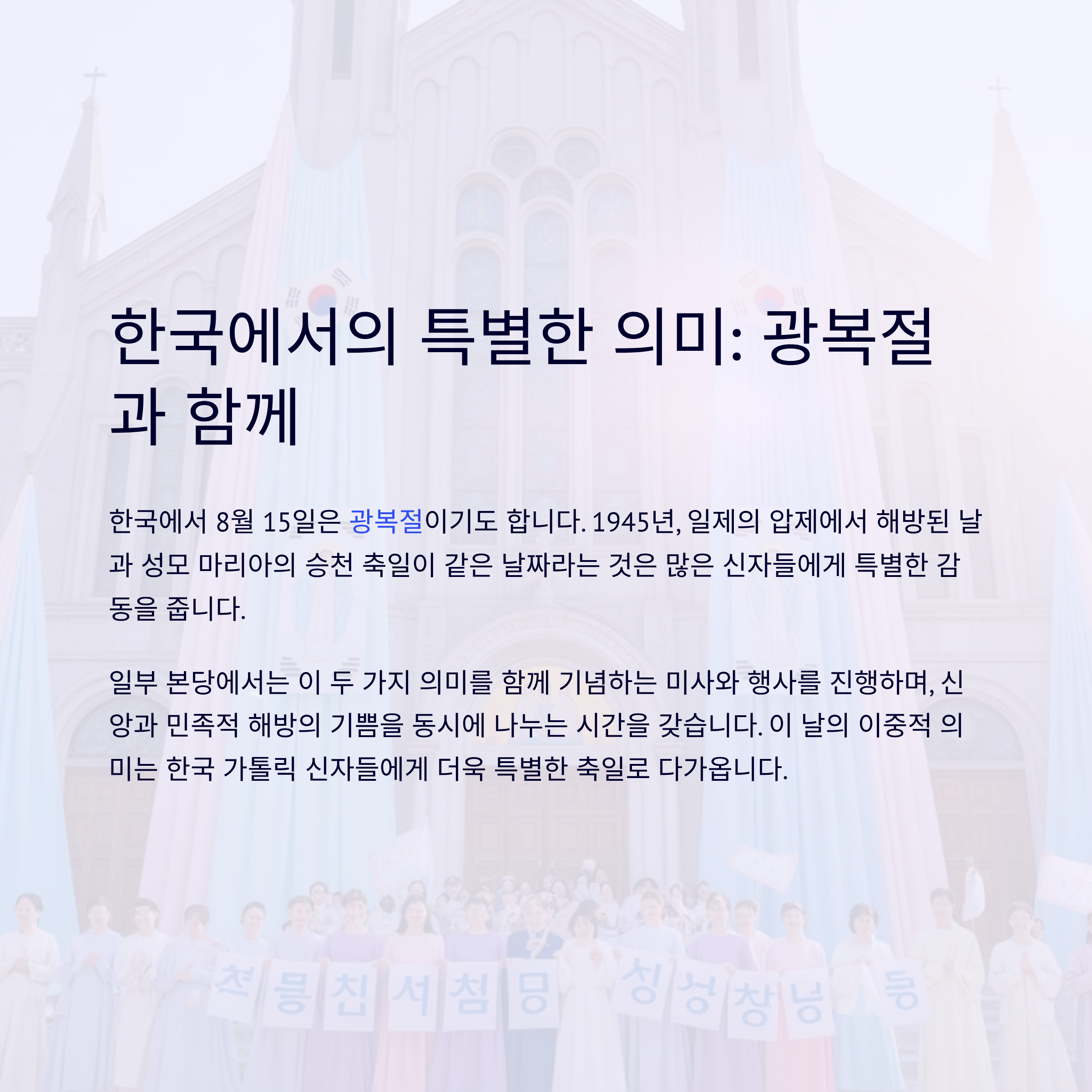 특히 한국에서는 이 날이 광복절과도 겹쳐, 종교적 의미뿐 아니라 민족적 의미까지 더해집니다.
