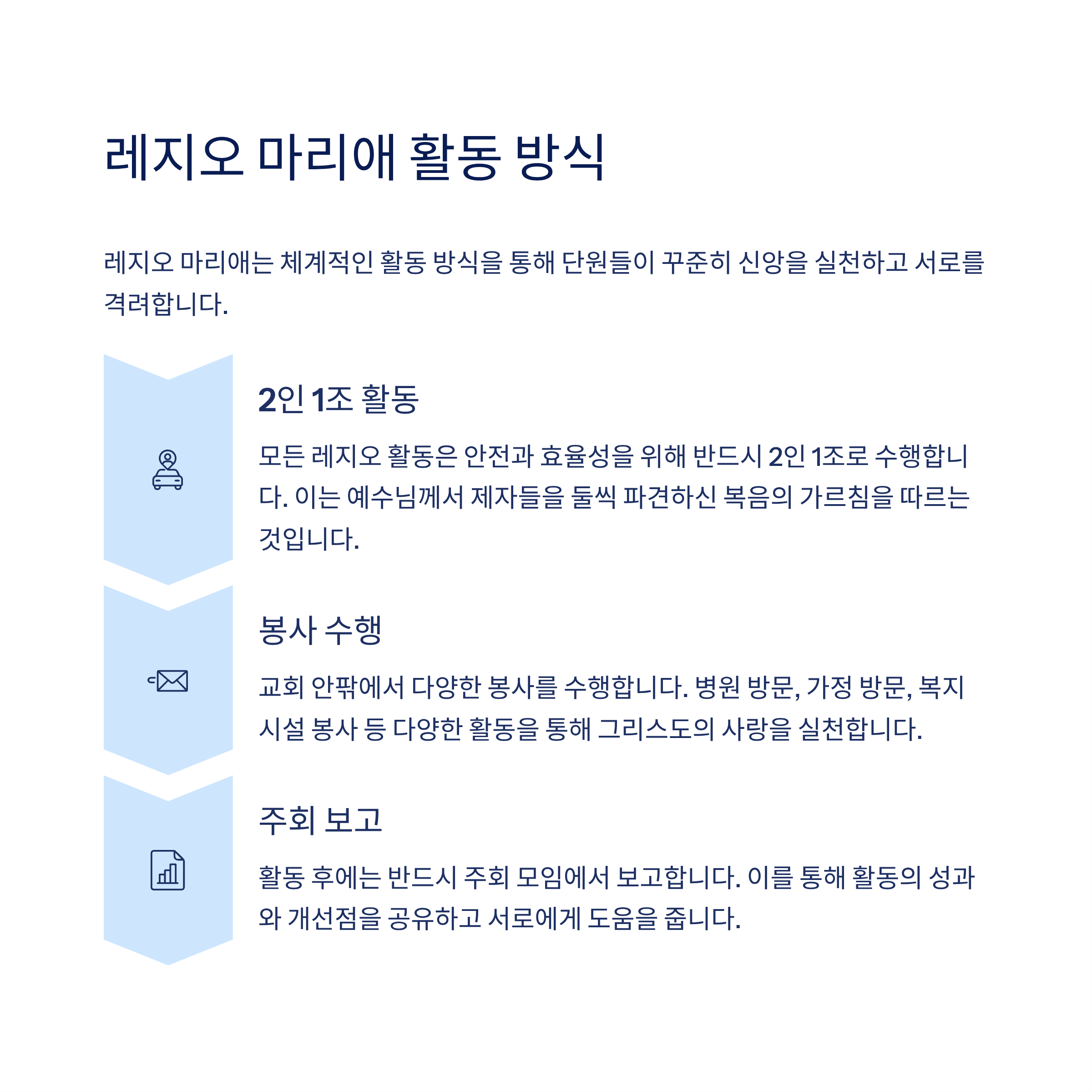 이러한 체계적 활동 방식은 단원들이 꾸준히 신앙을 실천하고 서로를 격려하는 힘이 됩니다.