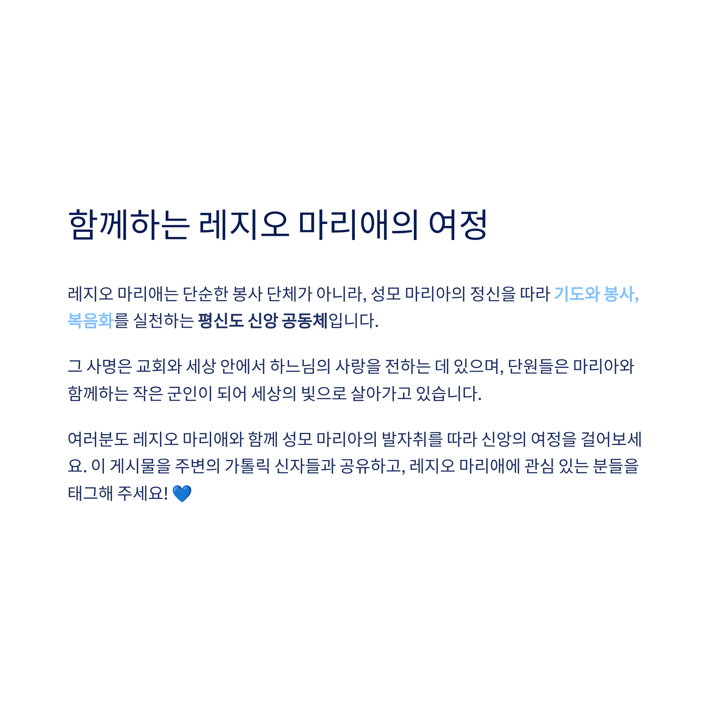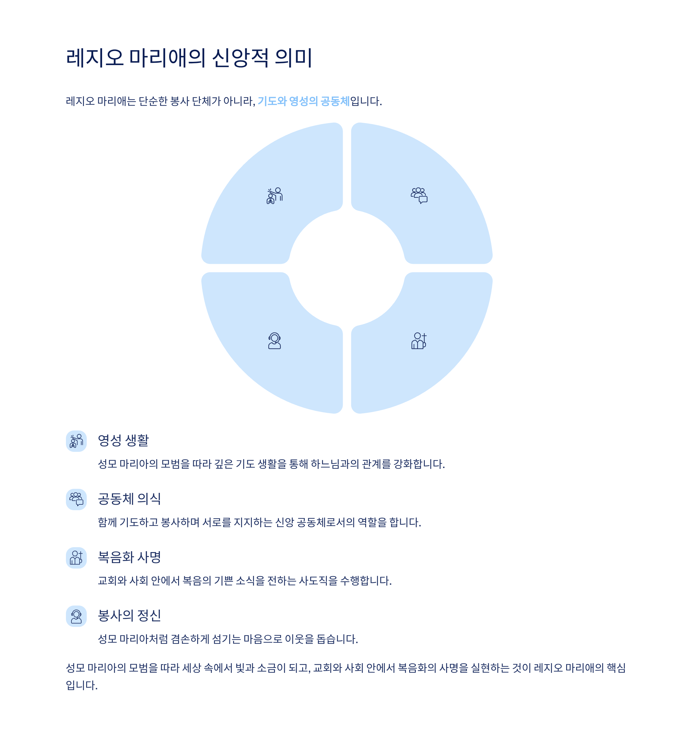 레지오 마리애는 단순한 봉사 단체가 아니라, 성모 마리아의 정신을 따라 기도와 봉사, 복음화를 실천하는 평신도 신앙 공동체입니다.